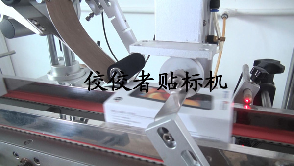 下面我們來介紹全自動上下面轉(zhuǎn)角貼標機的貼標全過程,首先將包裝盒放到傳送帶上,移動到下圖的黑色小柱體后面時被貼上轉(zhuǎn)角標簽,如下圖: