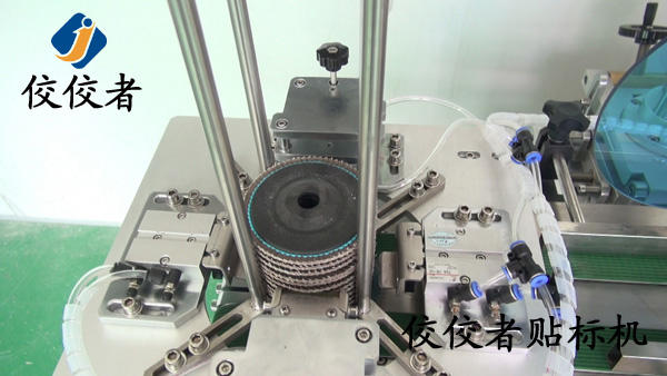 當砂輪片被送到機器中間貼上標簽時,貼標還并未完全結束,砂輪片還要經過下圖這個圓滾滾的柱體的適當碾壓才算可以,這個圓柱體在其他全自動貼標機上也有不同形式的出現,只是其大小和樹立姿態不同,但都有個共同的目的,就是讓標簽更緊實地貼在產品上,如下圖: